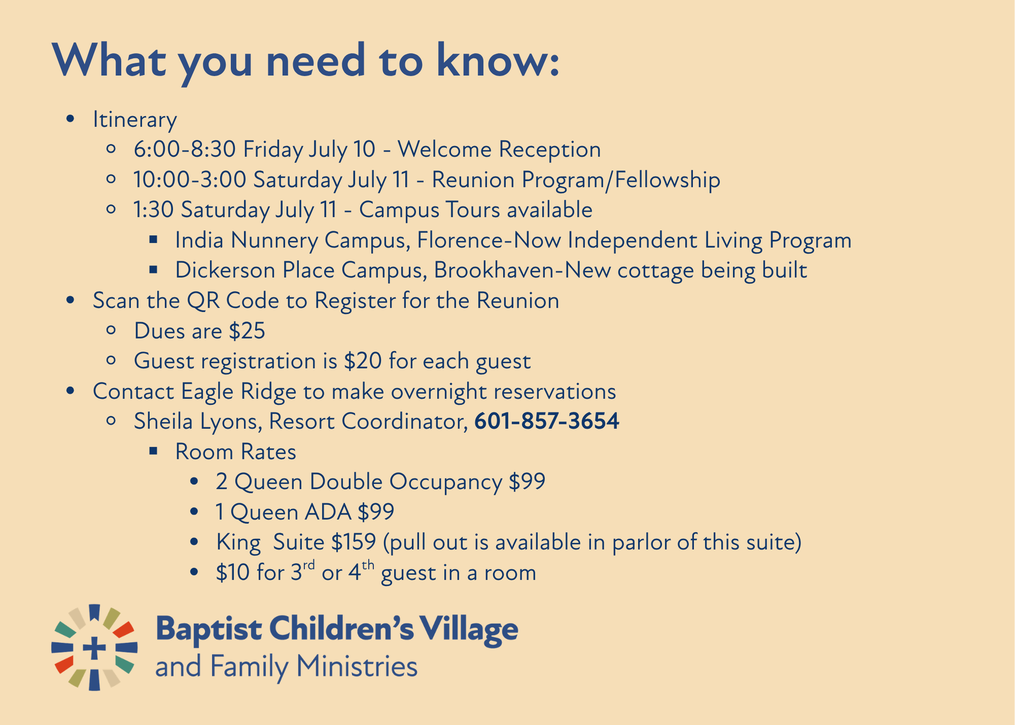 The Baptist Children’s Village 2024 Alumni Reunion was July 12-13, 2024 at Eagle Ridge Conference Center, 1500 Raymond Lake Road, Raymond, MS 39154.  Alumni had a great time catching up with old and new friends, winning door prizes, reminiscing while looking through BCV yearbooks and photo albums, and taking a tour of the Dickerson Place Campus in Brookhaven.
